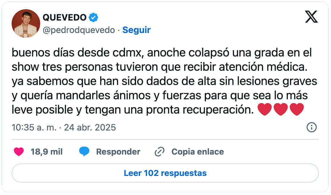 El artista español, Quevedo, compartió en la plataforma “X” un mensaje para las personas afectadas por el accidente, dándoles ánimos y fuerzas